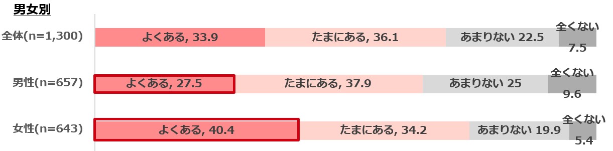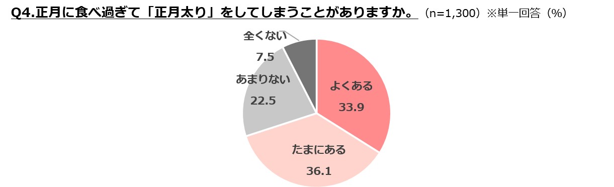 ・大晦日に食べるものは、「蕎麦」「寿司」「刺身」がTOP3。「蕎麦」は年代が上がるほど高く、20代と 60代では20pt以上の差がある。 ・おせちを食べる人は約半数。 ・正月に食べるものは、「寿司」「餅」「刺身」がTOP3。4位の「鍋料理」は、年代が上がるほど高くなる。 ・正月太りをしてしまうことは、「よくある」が34%、「たまにある」が36%。 「よくある」は、男性の28%に対して女性は40%。 ・正月のリセットグルメは、「雑炊」「野菜スープ」「サラダ」「豆腐」がほぼ同程度だが、「野菜スープ」は男女差が大きい。