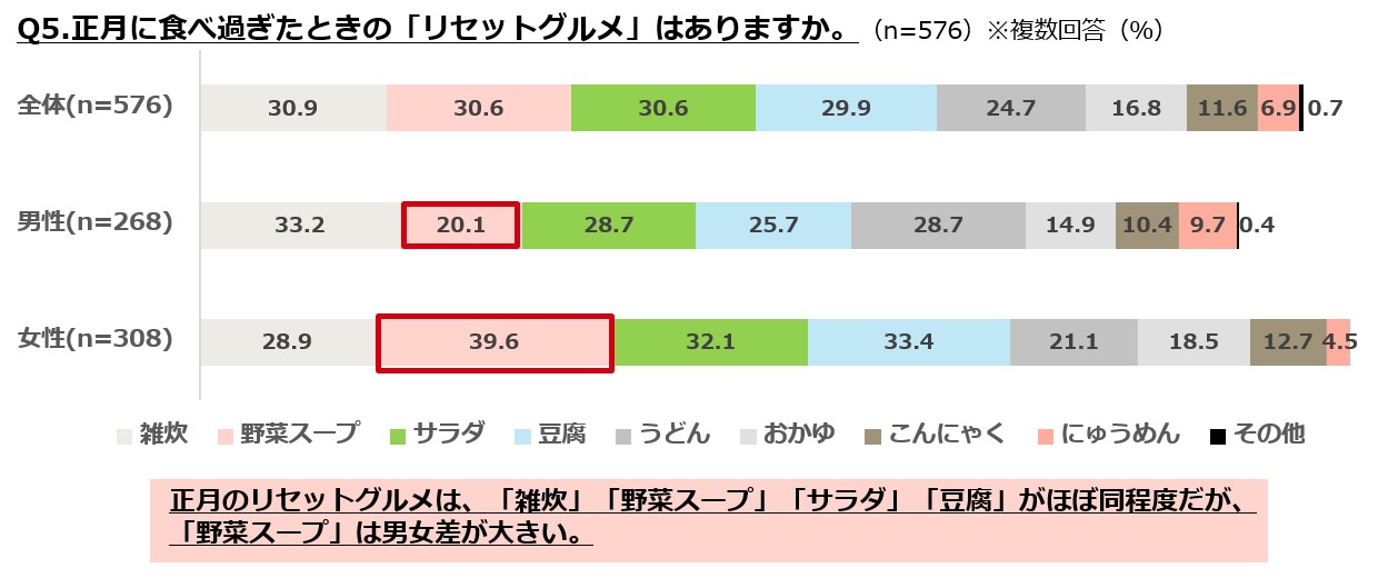 今回の調査では、年末年始の「食」の過ごし方について、性別や年代による傾向の違いが鮮明になりました。大晦日のメニューでは、「蕎麦」、「寿司」、「刺身」がトップ3を占め、年越し蕎麦を中心とする伝統が根強いことがわかります。特に「蕎麦」は、20代(32.1%)と60代(54.0%)で20ポイント以上の差があり、高齢層ほど伝統を重んじる傾向が明確です。 正月三が日のメニューでは、「寿司」、「餅」、「刺身」が上位です。 「餅」も、20代、30代と50代、60代では15ポイント以上の差がみられました。 また、おせち料理を「食べる予定がある」人は全体で51.3%と約半数にとどまりました。実は、資料には載せていませんが、20代、30代では全体と比べて低い傾向が見られていました。20代、30代の若者を中心に、お正月の食卓の多様化が進んでいるのかもしれません。 正月太りを「よくある」(33.9%)、「たまにある」(36.1%)と回答した人が合わせて7割を超えており、多くの人が連休中の食べ過ぎを経験。 「リセットグルメ」としては、「雑炊」、「野菜スープ」、「サラダ」、「豆腐」が僅差で並びましたが、「野菜スープ」は男性(8.2%)と女性(19.0%)で10ポイント以上の大差がつき、食後の調整法にも男女で意識差があることがわかりました。 ところで、お正月三が日に食べたい料理の2位にあがった「餅」。餅を使った伝統料理である雑煮は、地域によって出汁や具材、餅の形などに多様な違いがあるのが有名ですが、今回改めて自由回答で尋ねたところ、高級食材入りや、具沢山、出汁にこだわったものがある一方で、小松菜のみのシンプルなものまで、様々な意見があがり、日本の食文化の奥深さがうかがえました。お正月の食文化も多様化が進む今、あえて他地域の伝統的なレシピを取り入れてみるのも、新たな食の楽しみ方の一つです。ぜひ、各地に伝わる個性豊かなお雑煮に注目し、ご家庭で新しいお正月の味を探求してみてはいかがでしょうか。 【調査概要】 ■調査期間:2025年12月5日(金)~12月6日(土) ■調査方法:WEBアンケート ■調査対象:全国 ■回答者 :20代~60代のぐるなび会員1,300名