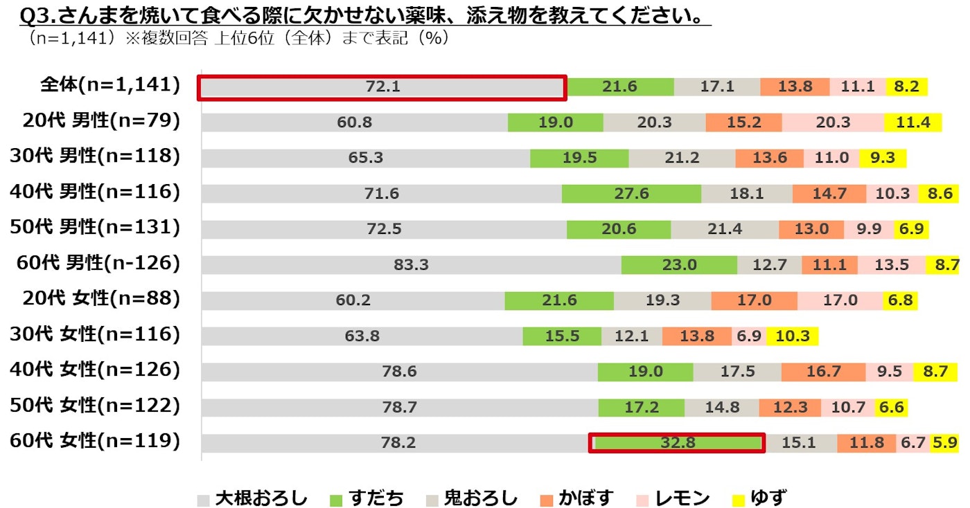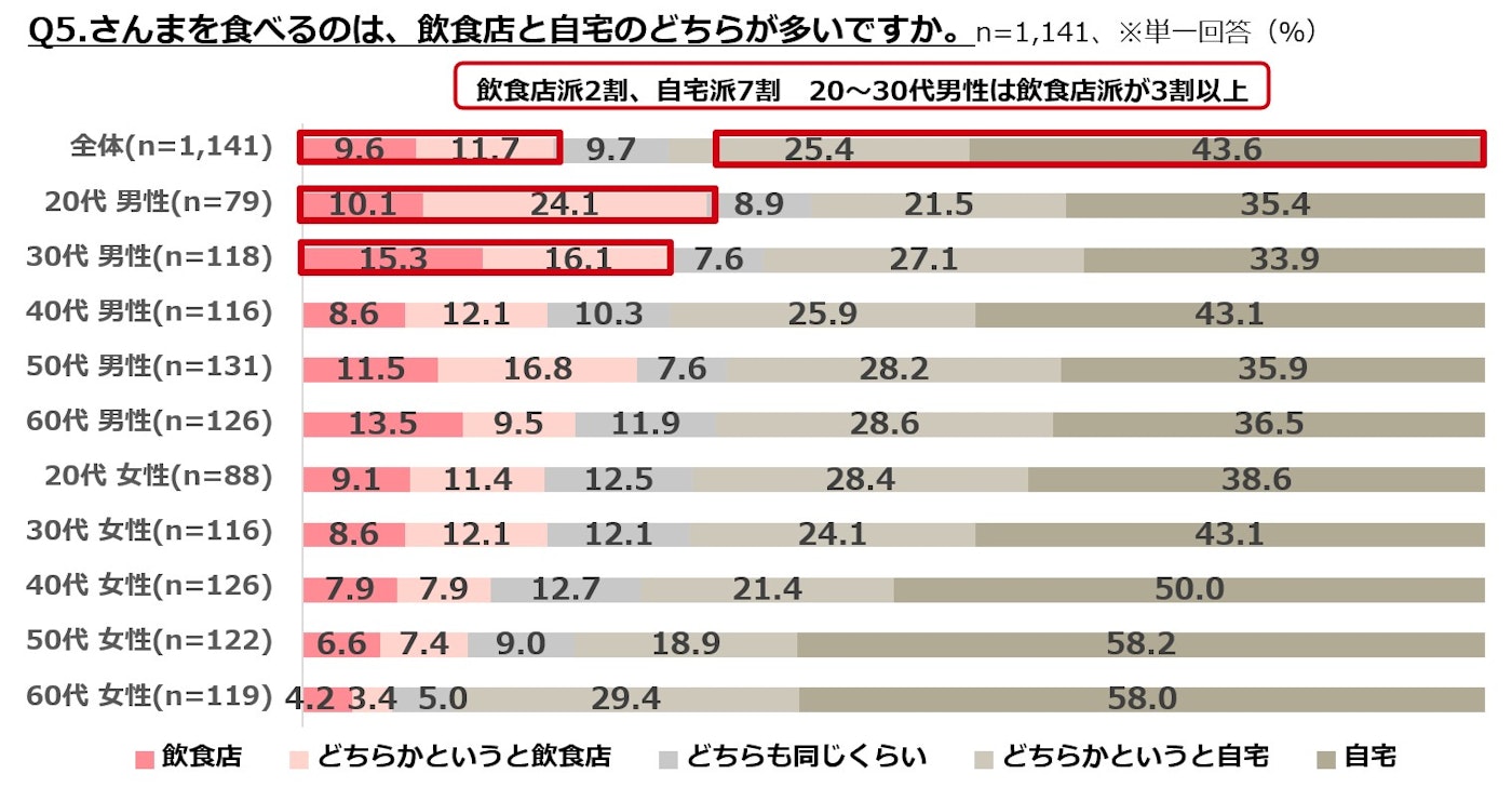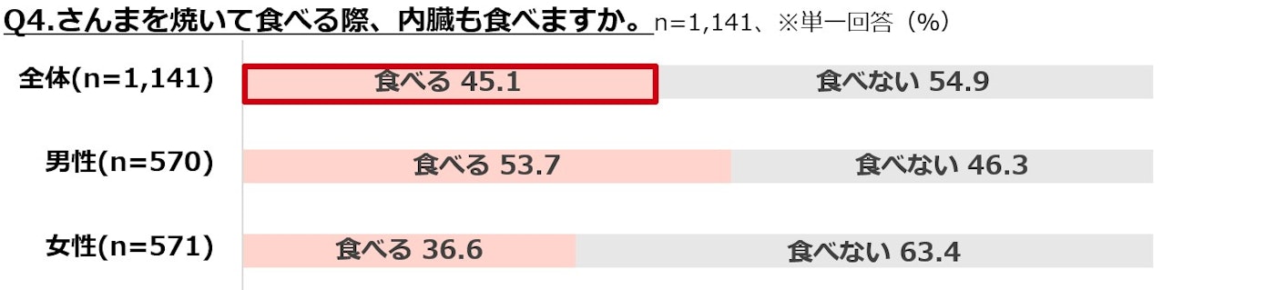 ・秋に食べたくなる食材は「さんま」「梨」「栗」がTOP3。「さんま」は50代で7割弱と特に高い。 ・今年さんまを食べた人は3割で、食べていないが食べたい人は6割弱。 ・さんまに欠かせない薬味、添え物は「大根おろし」が7割強で最多。60代女性では「すだち」が3割強。 ・内臓まで食べる人は45%で、男性の54%に対して女性は37%。 ・食べる場所は自宅派が7割、飲食店派が2割。20~30代男性は飲食店派が3割以上と高い。 ・さんまを食べるのが得意な人は47%。得意な人が最も多いのは50代男性で、20~30代女性は苦手な人が4割以上と高い。 ・今後希少性が増しそうな魚介類は「うなぎ」が半数弱で最も高く、以下「さんま」「マグロ」「イカ」「サケ」と続く。