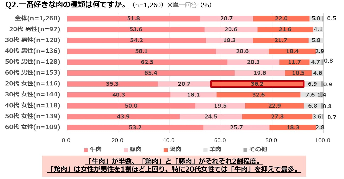 ・肉料理が好きな人は約9割。 ・一番好きな肉は「牛肉」が半数で最多。「鶏肉」と「豚肉」がそれぞれ2割程度。「鶏肉」は女性が男性を1割ほど上回り、特に20代女性では「牛肉」を抑えて最多。 ・無性に肉料理を食べたいと思うのは、「スタミナをつけたい、パワーが欲しい時」が最も高く、次いで「何か良いことがあった時」。 ・肉料理の外食頻度は「月に1日くらい」が最多で、月に1日以上外食する人が全体の3人に2人。 ・外食することが多い肉料理は、「焼肉」「ハンバーグ」「とんかつ、かつ丼」がTOP3。 「牛丼」は男女で20pt以上の差があり、男性では3位。「とんかつ、かつ丼」は年代が上がるほど高くなり、「ハンバーガー」は反対に若い年代ほど高くなる。 ・肉料理の店を選ぶ際の重視点は、「コストパフォーマンスが良い、お得感がある」が最も高く、次いで「ご馳走感がある、贅沢な気分になれる」。「とにかく安い」は若い年代ほど高くなり、20代では2位。 ・いい肉を外食する時の許容価格は「~5,000円」が最多だが、全体の半数弱は3,000円以内となる。