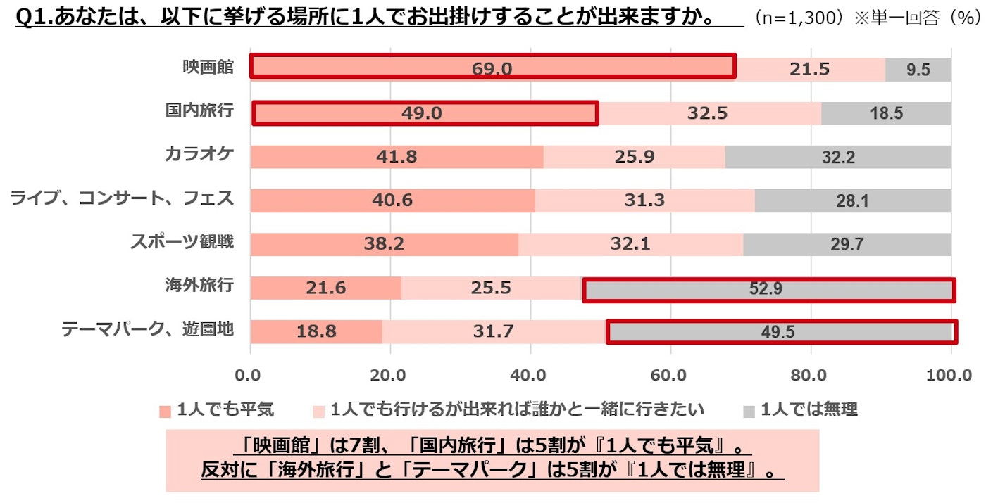 ・1人でのお出掛けについて、「映画館」は7割、「国内旅行」は5割が『1人でも平気』と回答。反対に「海外旅行」と「テーマパーク」は5割が『1人では無理』。 ・一人外食は、ランチは6割、ディナーは4割が月に1日以上あり。女性はディナーでの一人外食は「ほとんどない」が半数。 ・一人外食に抵抗がある人は、ランチは22%、ディナーは36%。ディナーで男女差がやや大きい。 ・一人外食の人に対して淋しそうと思わない人は84%。 ・外食の業態については、「立ち食いそば、うどん」「牛丼」「ラーメン」は7割以上が『1人でも平気』。そのいずれも、男女で20pt以上の差がある。一方で『1人では無理』は、「フランス料理」が5割強と抜きん出て高い。『1人でも平気』で唯一女性が男性を上回るのは「スイーツ」。 ・一人外食の良い点は、「自分のペースで食事ができる」「自分の好きな店に行ける」「自分の好きなメニューを注文できる」がTOP3。一方困ることは、「色々な料理を少しずつ食べることができない」が3割強で最多。